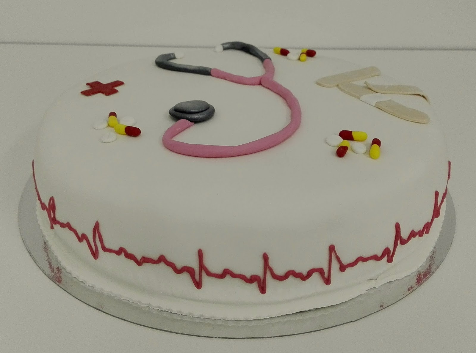 Ennen joulua sain tilauksen tehdä kakun sairaanhoitajan valmistujaisiin. Sain tilaajalta toiveet, että kakun koristeiden pitäisi selkeästi viitata sairaanhoitajan työhön. Kakku on melko iso pyöreäksi kakuksi, sillä sen mitoitus on kolmellekymmenelle hengelle. Makuna kakussa on mansikka-kermatäyte.