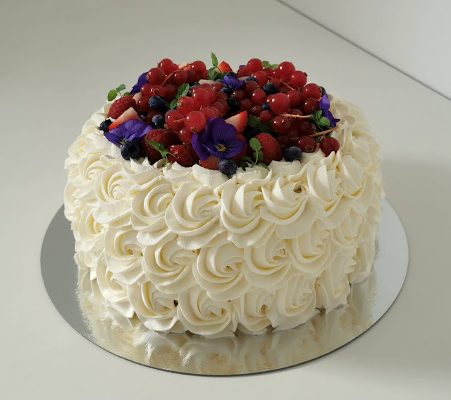 Koristeluun tuli eri värisiä ruusuja, harsokukkaa ja minttua.